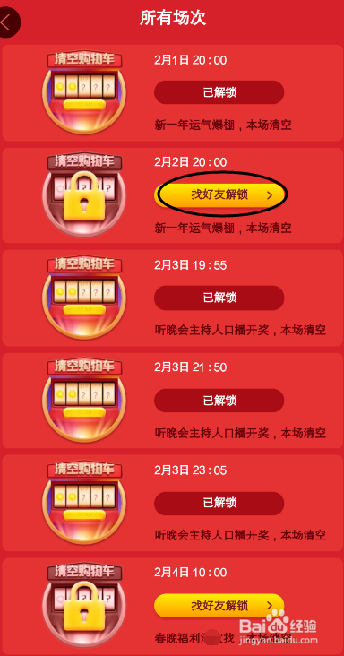 其他场次,可以经由过程邀请老友,点击【找老友解锁】让他介入活动,你也有机遇获得抽奖机遇,就可以解锁场次,出格是新用户,就可以获得3次机遇。