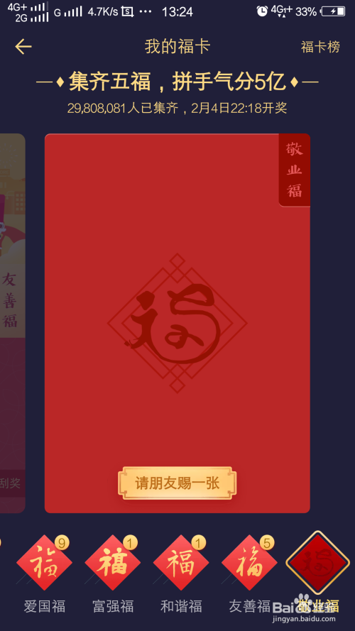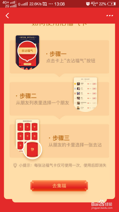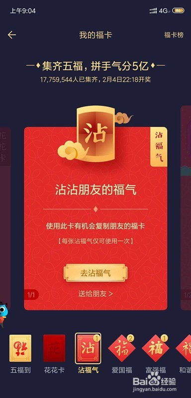 那么沾福分卡是怎么获得呢,其实沾福分卡与花花卡一样,任何集齐五福的活动都有几率可以获得沾福分,好比浇水、扫福等等。