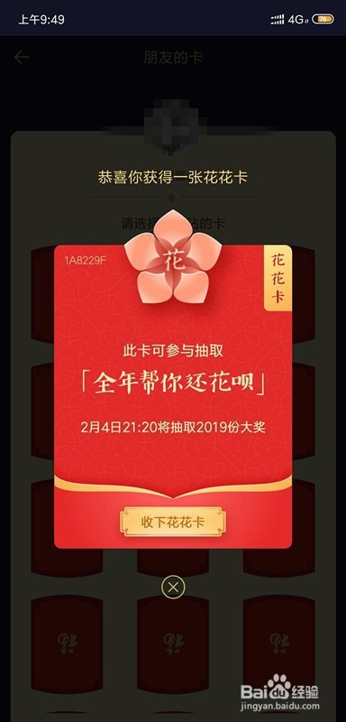 我们点击沾福分的下方去沾福分,选择一个伴侣,就可以去你伴侣的卡界面去沾福分,不外是随机的哦,要翻牌的,翻到阿谁卡就是阿谁卡。我伴侣就复制了我一张花花卡,如下图。