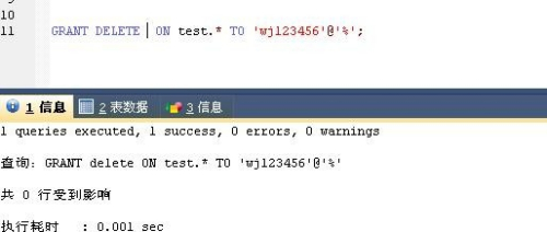 (root超等用户登录)把'wj123456'@'%'这个用户授权:mysql中的test数据库的所有表可以删除数据。