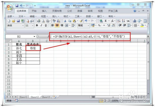如下图所示,有两个excel文件,此刻要检测new文件中sheet2中姓名,是否存在于new文件中sheet1、data文件sheet1中存在,若是存在,在厥后显示“存在”,不然显示“不存在”。