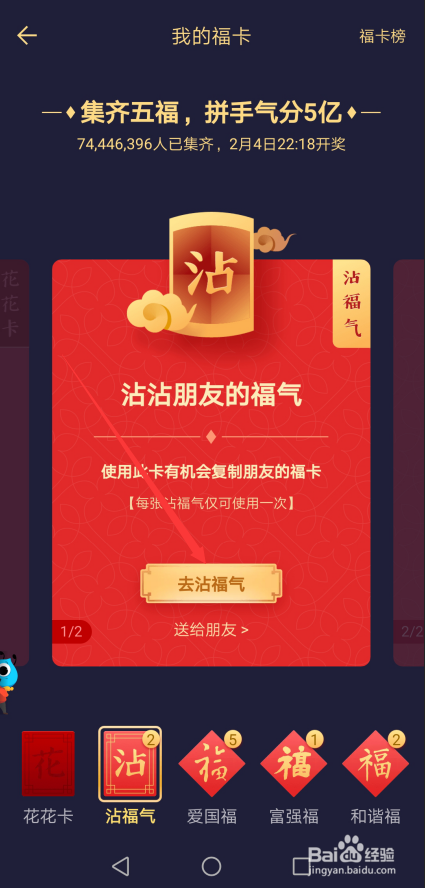 在我的福卡界面里先选中沾福分卡,然后在点击【去沾福分】,如下图所示。