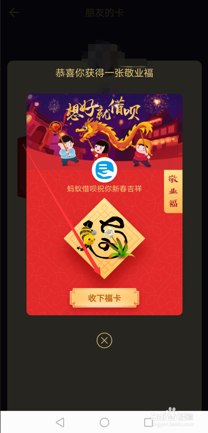 点击后,付出宝提醒恭喜你获得一张敬业福卡,如下图所示。