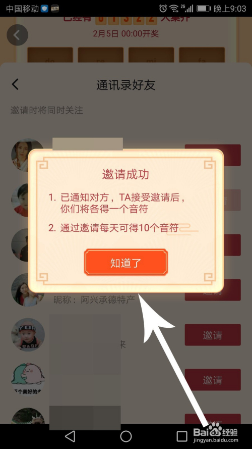 打开“邀请老友得音符”老友列表今后,点击老友右侧的“邀请”按钮,打开提醒弹窗后点击“知道了”