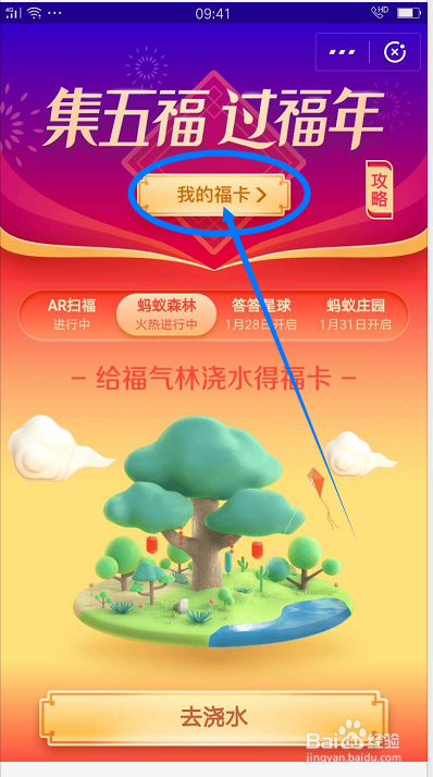 首先登录本身的付出宝,进入付出宝首页之后,进入集五福的活动页面,点击进入。