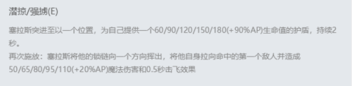 E技术——潜掠/强掳。塞拉斯突进到一位置,为本身供给一个60/90/120/150/180(+90%AP)生命值的护盾,2秒时候。再次释放,塞拉斯的锁链会标的目的一个偏向挥出,然后将本身拉标的目的射中的第一个仇敌以及造当作50、65、80、95、110(+20%)魔法危险,还会有0.5秒的击飞结果。
