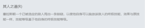 年夜招R——其人之道。塞拉斯标的目的一个已被选定的仇敌甩出一条锁链,以使它自身可以释放该仇敌的年夜招,结果与原技术一样,技术品级基于塞拉斯自身的年夜招品级。换句话说,就是塞拉斯的年夜招不是固定的,需要看他的仇敌是哪一位英雄,若是仇敌是瞎子,那么塞拉斯的年夜招就和瞎子的年夜招一样,把仇敌踢飞。
