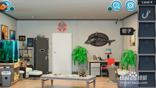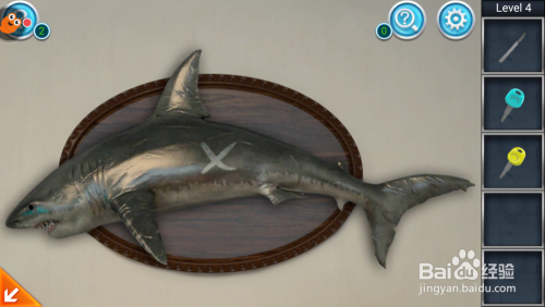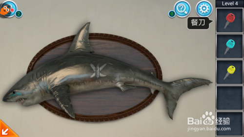 操纵小刀将前方墙面的鲨鱼模子割开,掏出里的钥匙。