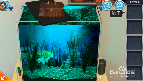 将灯绳用钳子折当作弯度,操纵灯绳将左面鱼缸里面的箱子钩出来。