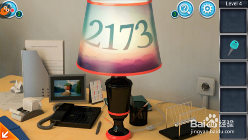 打开箱子,将里面的钥匙和灯胆掏出来,将灯胆安装台右面书桌的台灯上,并记住上面的数字。