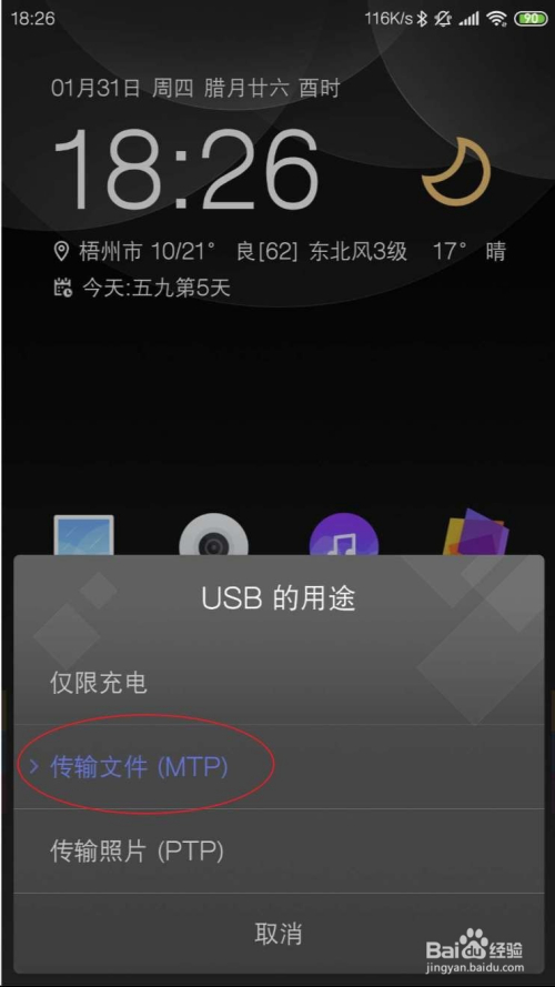 然后把手机毗连到电脑,然背工机选择MTP了。