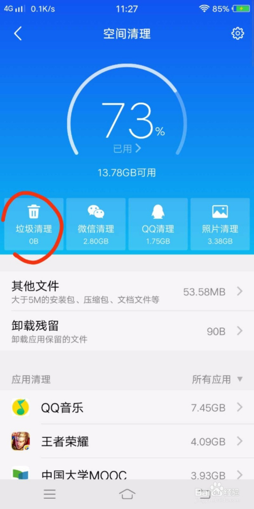 然后再归去方才空间清理阿谁页面,可以看到垃圾清理这一项已经是0了,因为方才清理过了嘛。利用同样的方式可以清理其他垃圾哟。