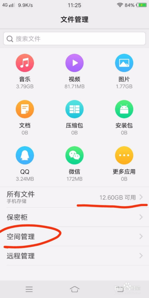 点进去文件办理可以看到还有几多内存可以用,进入空间办理可清理手机内存。