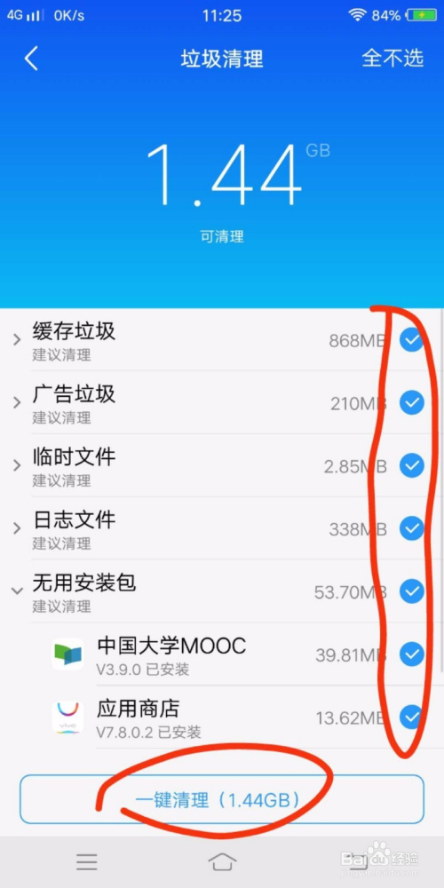 右边可以勾选你要清理的垃圾选项,若是不想清理就把√去失落,默认是全选的哈。然后点下面的一键清理。