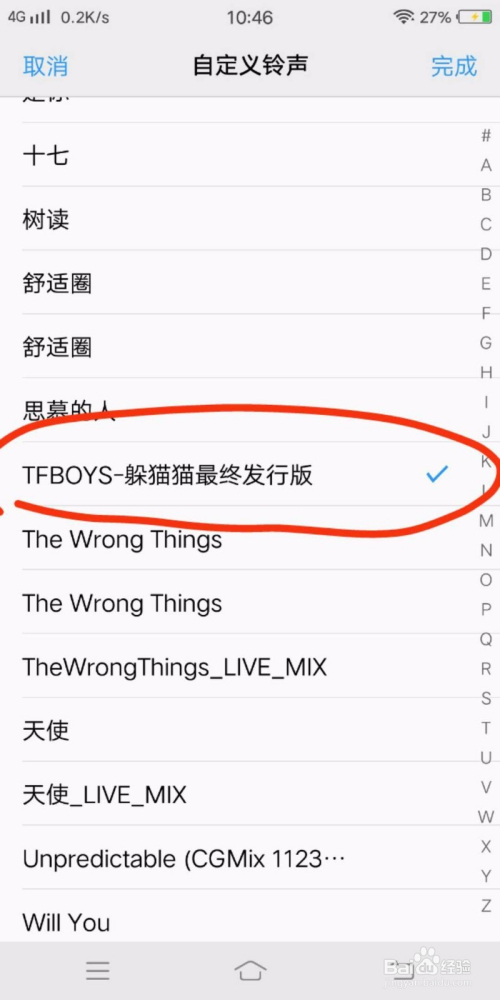 自界说点进去,这里选择想要设置为来电铃声的音乐,可以看到后面有个蓝色的小勾勾呈现,点右上角的完当作。