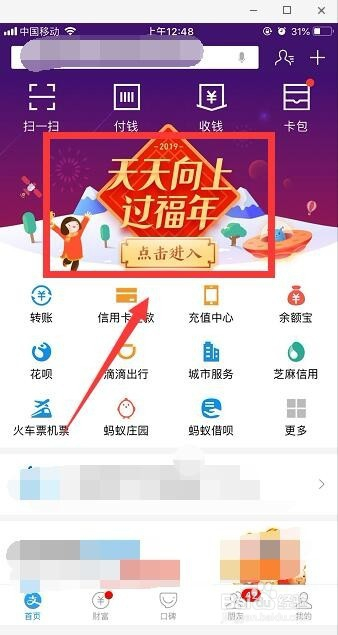 这里有显示,天天到店里第一笔付条目可以领到沾福分卡,我们还可以扫福获得,点击“AR扫福”→“扫一扫”。