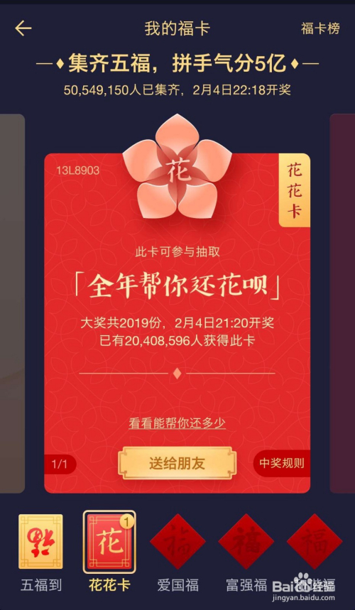 每张花花卡都有编号。若你的编号与中奖号码一致,就是中奖了,进花花卡页面会有提醒中奖成果。