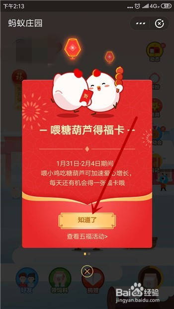 打开蚂蚁庄园后会提醒喂糖葫芦得福卡,点击【知道了】。