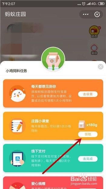 在蚂蚁庄园里需要打开领饲料使命,所以点击【领饲料】。