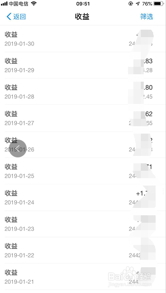 在明细本家儿页下,可查看比来余额宝的所有出入明细。若只查看收益,则点击右上角的【筛选】按钮!