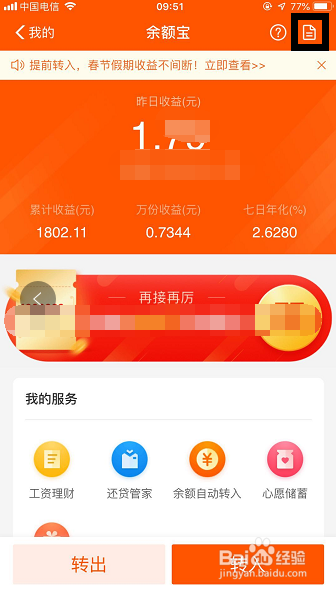 在余额宝本家儿页的右上角,有一个账单模样的图标,如图所示,点击此图标,则可进入【明细】本家儿页!