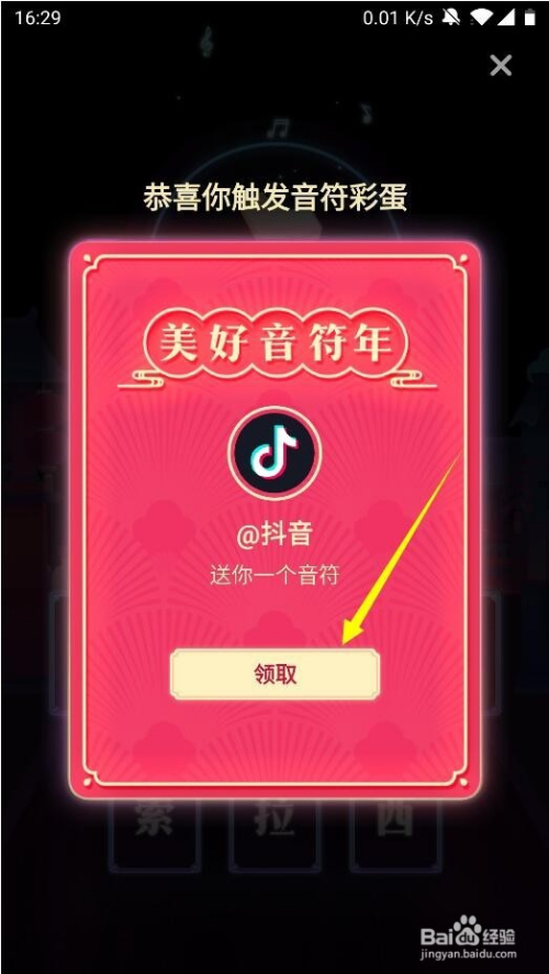 如图我们会弹出一张音符卡,我们需要点击音符卡中心的领取按钮就可以完当作领取