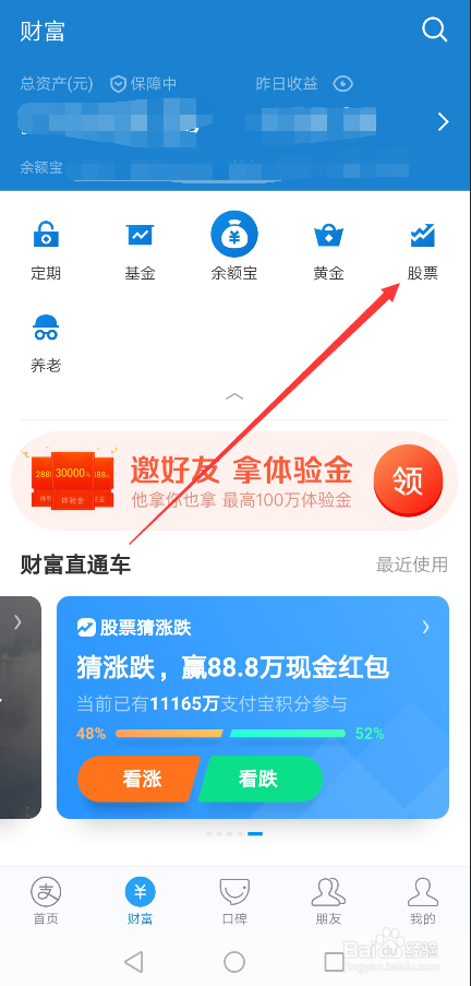 进入付出宝财富界面后直接点击右上角的【股票】,如下图所示。