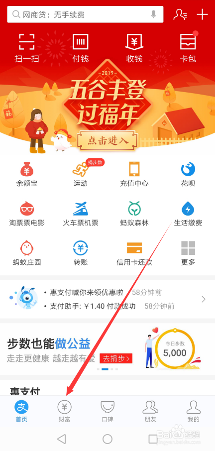 打开并登录付出宝,然后直接点击付出宝底部的【财富】,如下图所示。