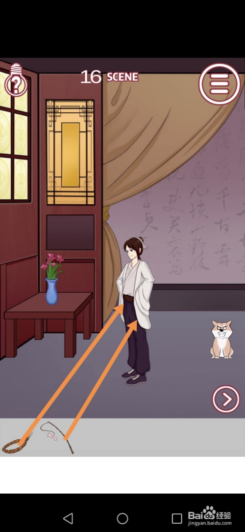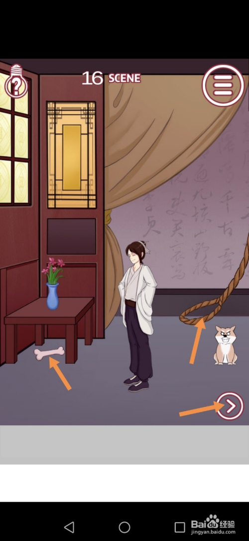 第16关先点击骨头和绳索,然后点击标的目的右箭头到右边去。