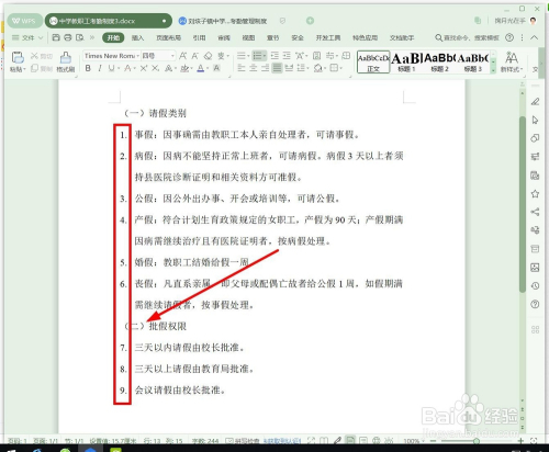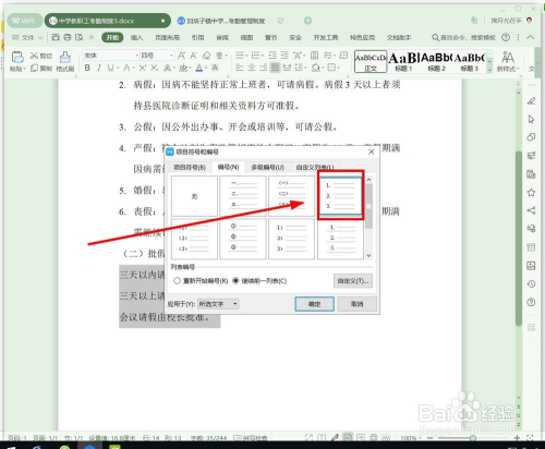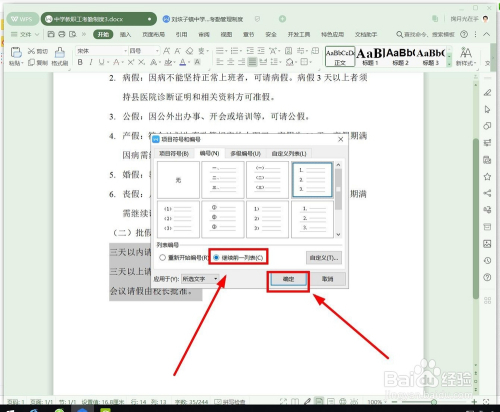 在“列表编号”项面前目今,有两个选项。若是选中第一种“从头起头编号”,就意味着第一年夜项“告假类别”下的编号和第二年夜项“批假权限”下的编号是不持续的,若是选择第二种“持续前一列表”,就意味着所有的小项编号都是持续的。我们选择第二种后单击“确定”