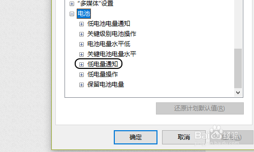 接着在弹出的高级设置对话框,双击最下方的“电池”选项,然后即可看到“低电量通知”了,见图二;