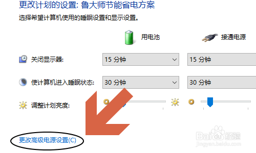然后我们点击电源打算右侧的“更改打算设置”这一项,在切换至的新页面里找到“更改高级电源设置”;