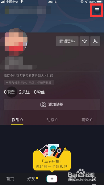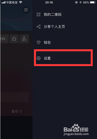 在我的本家儿页右上角,有一个三条横线的图标,如图所示,点击此图标!点击后,屏幕左侧弹出了更多的功能按钮,点击此中的【设置】!