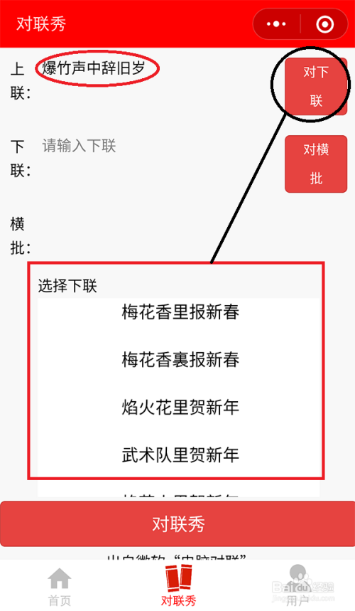 别的,也可以点击【春联秀】,本身写上联,再点击“对下联”“对横批”,到时会显示有可以参考的下联和横批。