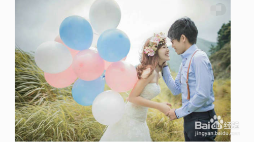 要想拍摄好婚礼外的照片,可以找一些道具作为拍摄元素,好比下图用气球做为照片的部门内容,显得很是有趣乐不雅,像是年夜天然中俄然降临一对幸福之人。