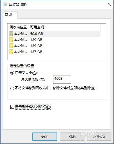 在收受接管站属性对话框,勾选“显示删除确认对话框(D)”,点击【应用】,然后点击【确认】。