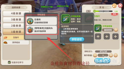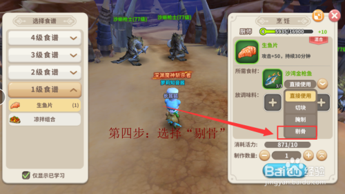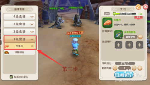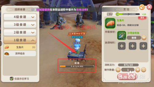 打开糊口职业“厨师”操作面板今后,点击一级食谱选择“生鱼片”食谱。