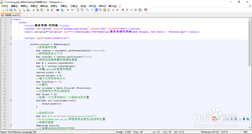 利用“Notepad++”编纂“代码雨.html”文档,将以下代码复制粘贴到文档中,然后保留。