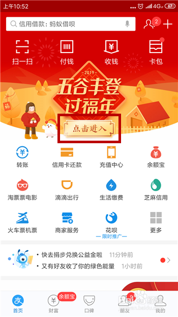 收集好后在付出宝里的首页中点击进入集五福活动。