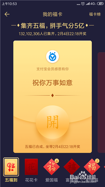付出宝的集五福一旦集齐的话就可以合当作五福到,那么怎么合当作呢?