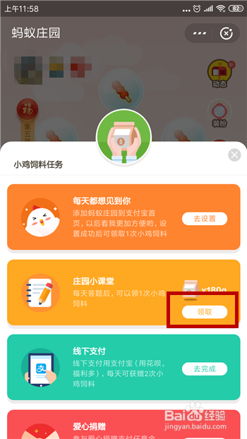 在领饲料使命里找到【庄园小讲堂】,然后点击此中的【去答题】。