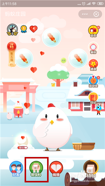 打开蚂蚁庄园后在底部的位置找到【领饲料】使命并点击。