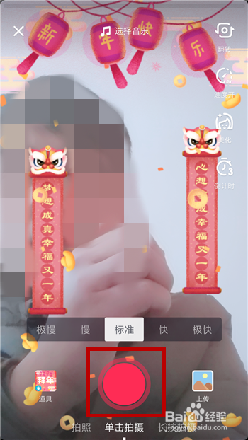 转换镜头至正面,然后对着镜头贺年,接着就会徐徐呈现春联,点击【录制】按钮起头录制贺年视频。