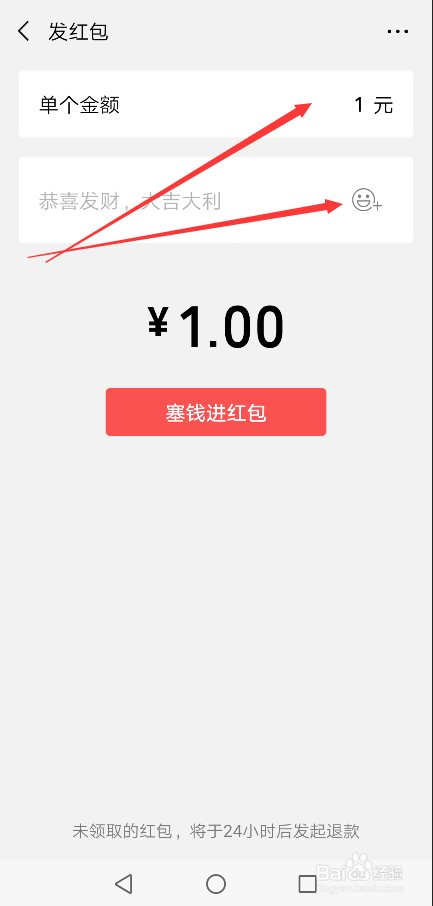 在微信发红包界面里直接输入金额,然后在点击金额下面的脸色头像,如下图所示。