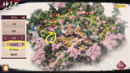 我们点击垂钓今后,会呈现良多种类的鱼,我们点击选择一个鱼的种类,会在地图上看到鱼群的位置,如下图黄笔标识,我们点击地图的位置前去。