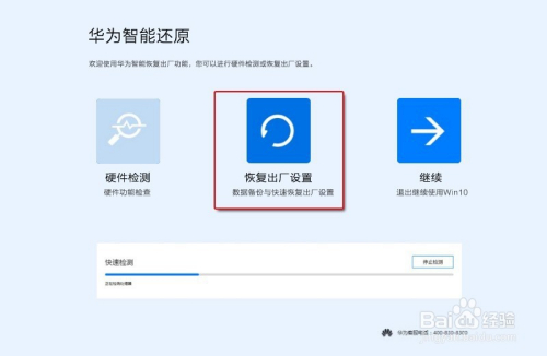 注重:若是在按 F10 键之后,进入的是华为智能还原界面,选择“恢复出厂设置”即可进入华为恢复出厂界面。
