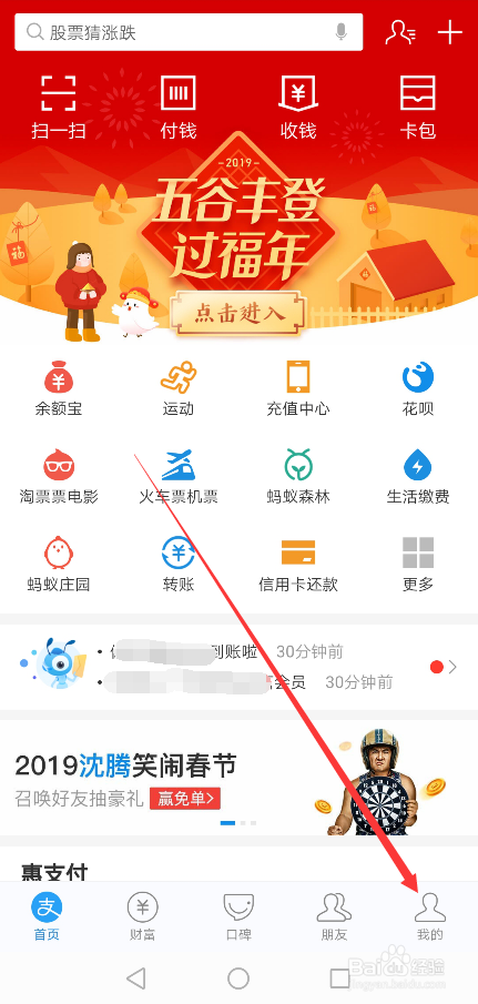 打开付出宝,然后直接点击付出宝首界面底部的【我的】,如下图所示。
