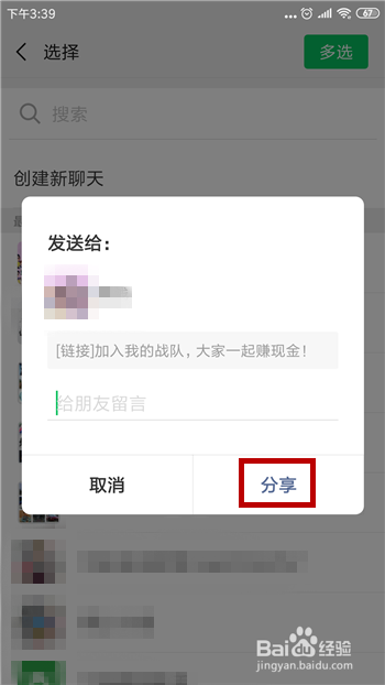 点击后需要确认是否组队该老友,点击【分享】选项。