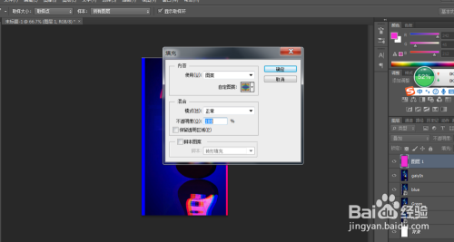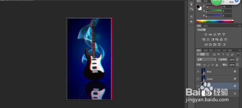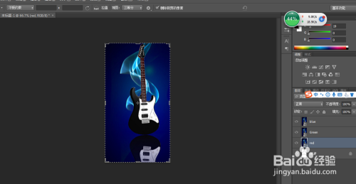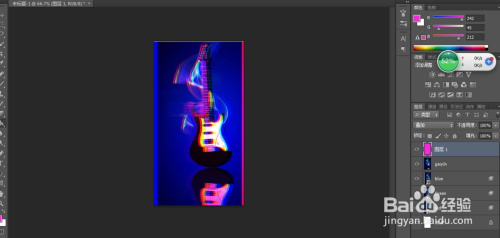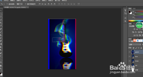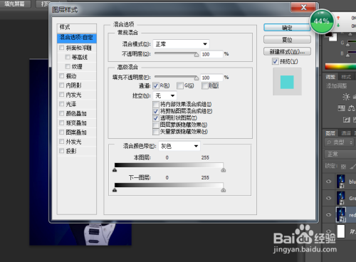 利用快捷键复制出3个新的图层,并别离定名为red,green,blue,并别离将每个图层的夹杂样式进行调整,red图层中只选中red通道,green图层中只选中green通道,blue图层中只选中blue通道