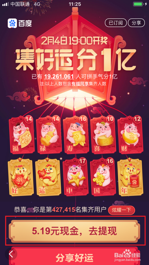 百度的集好运分1亿活动已经圆满竣事了,大师是否集齐了金猪呢,集齐了金猪的小伙伴们已经等分完奖金了。本文介绍下如何把奖金提现。